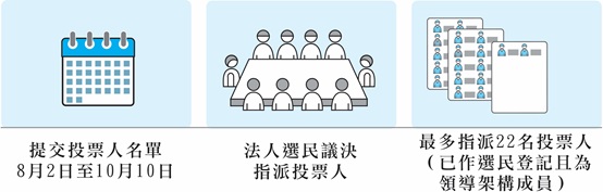 已在身份證明局登記、獲確認屬於相關界別至少滿4年且取得法律人格至少滿7年的法人,如已按照《選民登記法》作登記,並被登錄於2019年1月已完成展示的選民登記冊內代表相關界別,則推定在間接選舉中具有投票資格。
